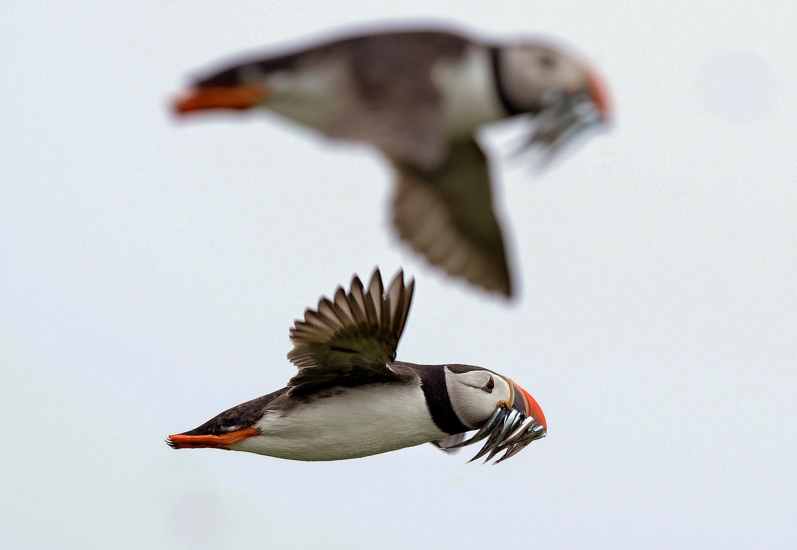 Each year, the Puffins return to the Farnes to breed. This is generally between April and late July with the peak breeding season being in May and June. For the remainder of the year, the birds fly out to sea, overwintering on the water, only returning to land each year for a short window to breed and raise their young. It is while out on the water, that they shed their brightly coloured bills, in favour of a dull grey winter bill colouring. But, as spring approaches, the vibrant colours return and, by the time they settle on land again, the bill is clear again for all to see. It is on, and in, the water though that Puffins, like many seabirds, gain their agility. On land they might appear awkward or clumsy, but on their home territory, the water, their evolutionary development shines. Underwater, while steering with their feet, the Puffin's wings become flippers, propelling them to depths at great speed in their quest for the next meal.